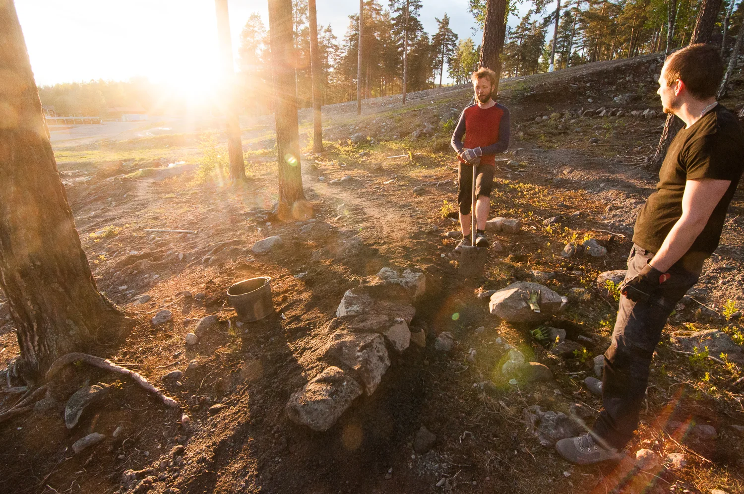Till skillnad från förra tisdagens misärväder var det idag betydligt lättsammare tongångar. Det märktes även på byggtakten som var mer än god. När kvällen rundades av hade vi byggt oss nästan ända upp till toppen av sluttningen, gjort en alternativlinje med några luriga knixar, byggt en balansfeature av sten, med mera med mera. Samt självklart avhandlat livets alla stora frågor hängandes på ett spadskaft som sig bör.